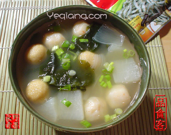 蘿卜与洋蔥炖軟之後,下一些魚丸、蝦丸之類。韓國人喜歡用的是魚糕,所謂Fish Cake,也就是海鮮打成漿後搭配淀粉類做出的食品。魚丸、蝦丸稍煮,再放一些海帶進去。海帶是韓國海帶,乾的,淡的,溫水發軟之後,下到湯里,几分鐘就好了。