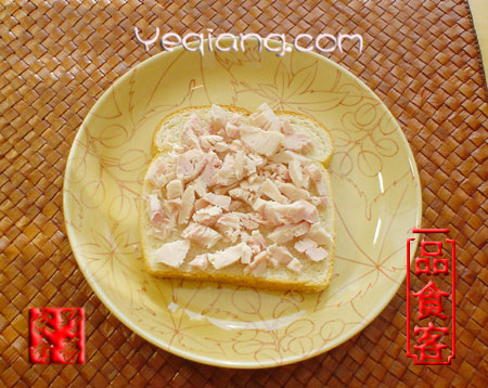 麵包上放一層切碎的火雞雞胸肉,