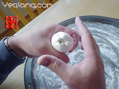 以虎口將其口邊逐漸收攏。邊口不能象餃子﹑包子那樣打折。否則最後不圓。