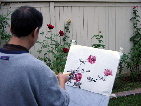 徐先生在美国亚历桑拿州立大学教授中国书画,下面是我俩2006年元旦合作的一张小品:"前村深雪里,昨夜一枝开"。